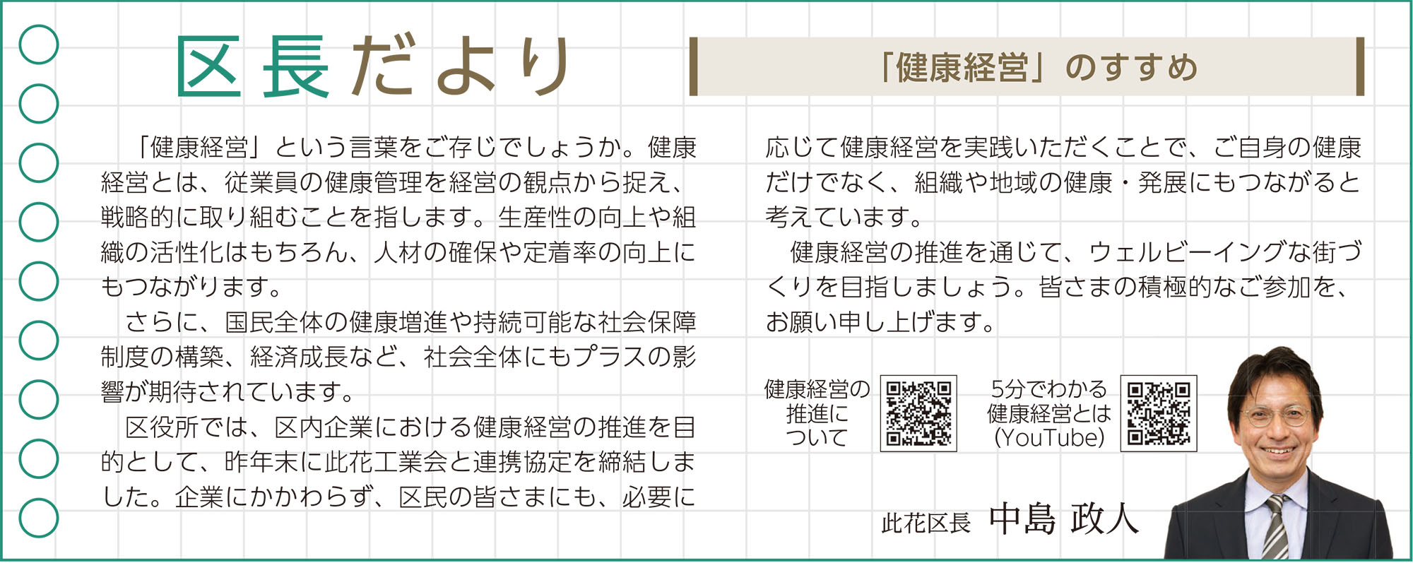 区役所では、区内企業における健康経営の推進を目的として、昨年末に此花工業会と連携協定を締結しました。企業にかかわらず、区民の皆さまにも、必要に応じて健康経営を実践いただくことで、ご自身の健康だけでなく、組織や地域の健康・発展にもつながると考えています。