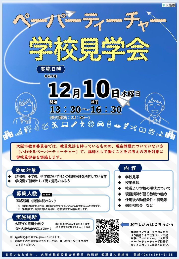 大阪市教育委員会では、教員免許を持っているものの、現在教職についていない方(いわゆるペーパーティーチャー)で、講師として働くことをお考えの方を対象に学校見学会を実施します。