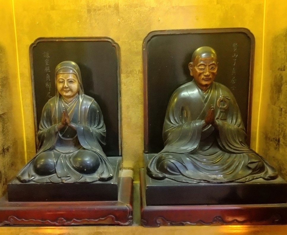北村六右衛門(1644~1708)は和泉国出身の豪農で、現在の大正区の泉尾や北村周辺にあたる地域を、泉尾新田・北村新田として開墾した人物である。新田開発の際に真宗の庵寺を営み、その後庵寺が寺院化して、現在泉尾に寺地を構える了照寺となった。了照寺には、北村家にまつられていた六右衛門夫妻の木像が安置されており、了照寺真宗関係史料の一部として、 大阪市指定有形文化財となっている。この像とは別に新田会所にも夫妻の木像がまつられておりこれが六右衛門の子孫である北村氏宅に伝来している。制作年代は江戸時代で、了照寺の像と相互に補完する関係にある、貴重な歴史資料である。