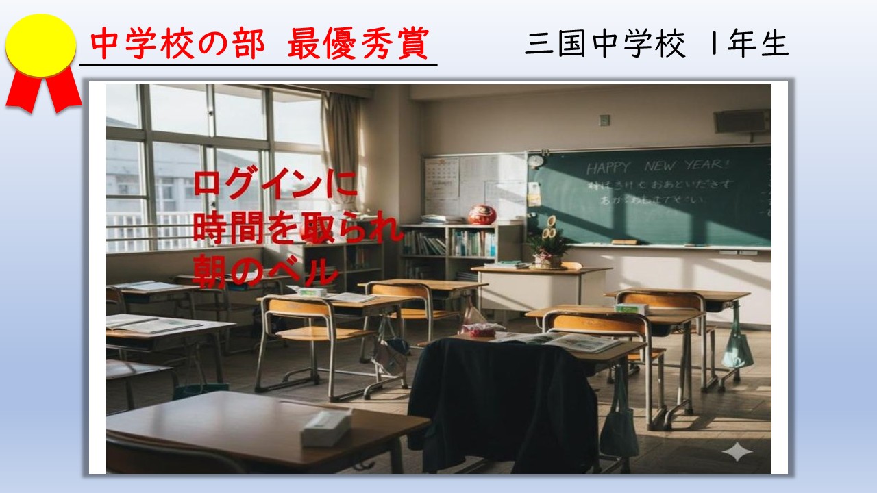 「ログインに時間を取られ」は誰もが経験する「あるある」です。ICTが「便利」だけでなく「時間を取られる」ものであることを中学生らしい実感で表している秀句です。また、朝の教室の様子と赤文字を対比させて工夫が見られます。