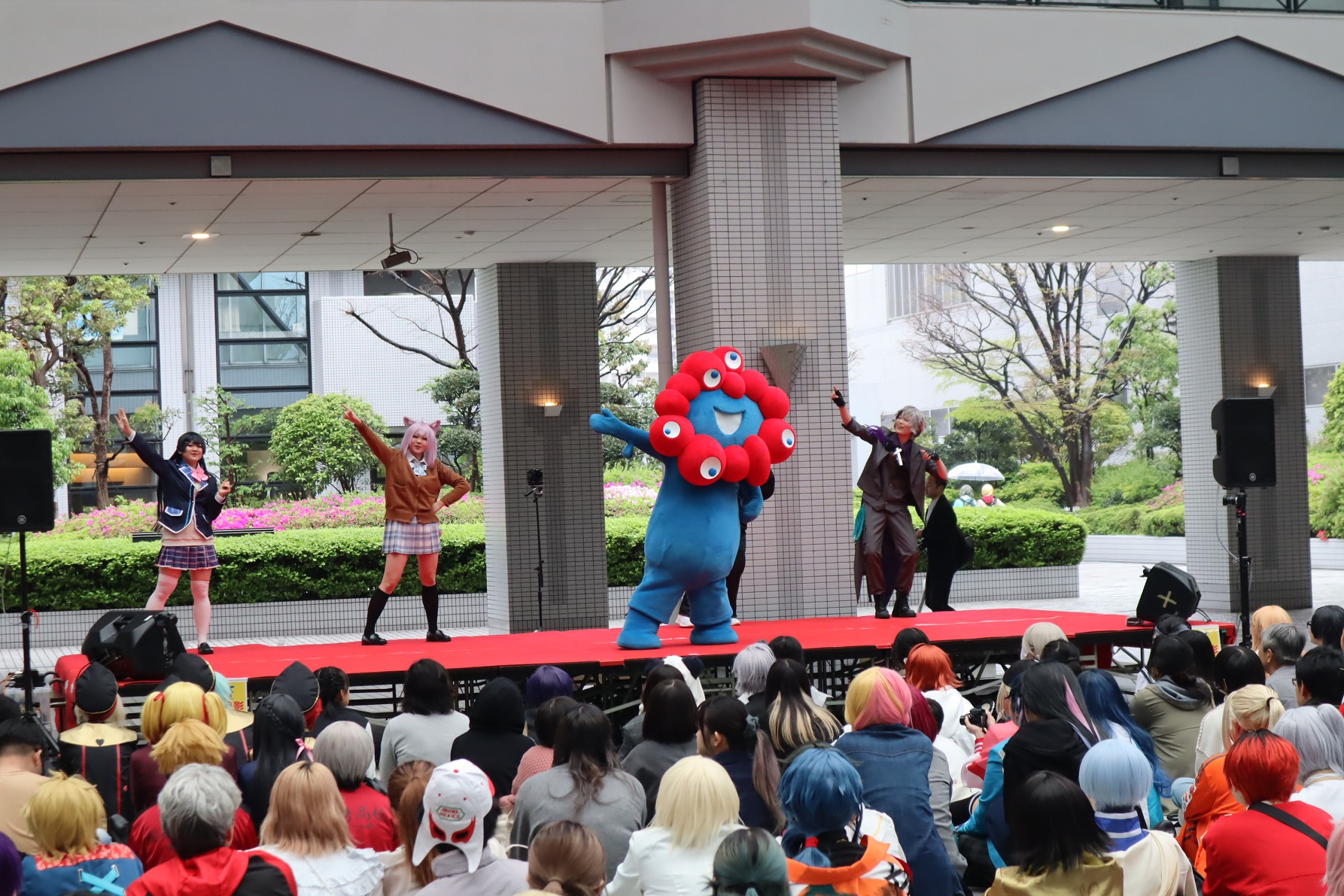 もと市岡商業高校において開催したコスプレ×ごみ拾いイベントに、ミャクミャクが登場し、コスプレイヤーが写真撮影を楽しんでいました。