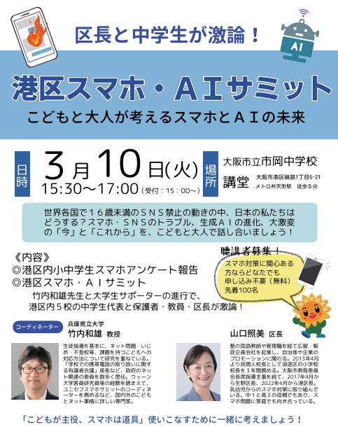 報道発表資料 「区長と中学生が激論!『港区スマホ・AIサミット』~こどもと大人が考えるスマホとAIの未来~」を開催します