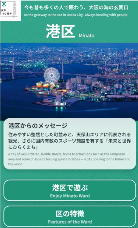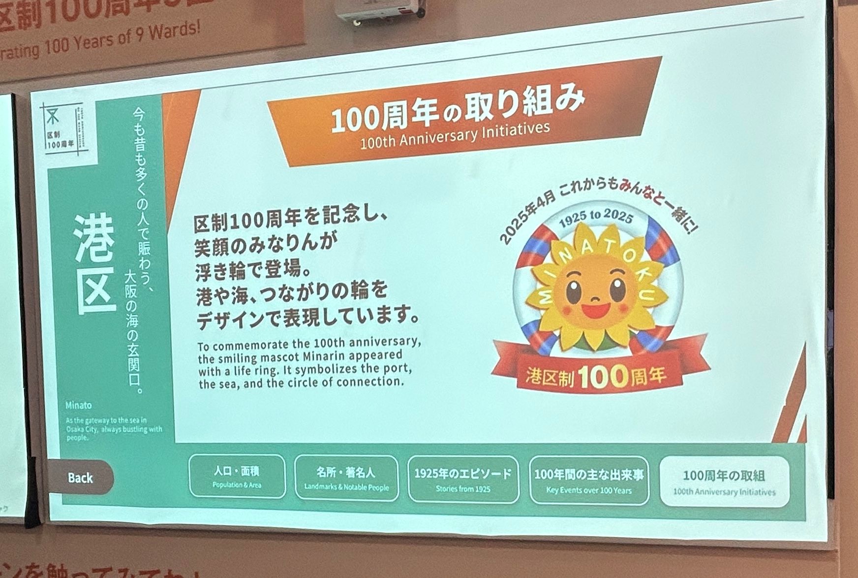 区制100周年を記念して、港区を含む9つの区が大阪・関西万博の「EXPO2025大阪ウィーク秋(地域の魅力発見ツアー~大阪43市町村の見どころ~)」のみなはれゾーンにおいて、記念映像を放映しました。100インチの大型ビジョンで、港区の歴史や名所、ゆかりの著名人などを紹介し、万博に来場された方に港区の魅力を伝えました。