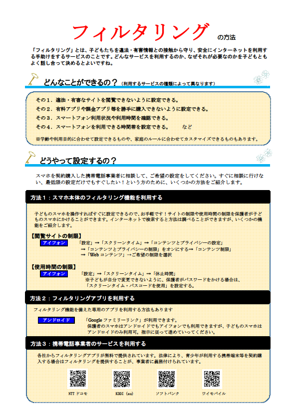 保護者の方向けに、子どもがインターネットを安全に使える手助けをする「フィルタリング」の設定方法等を紹介しています。