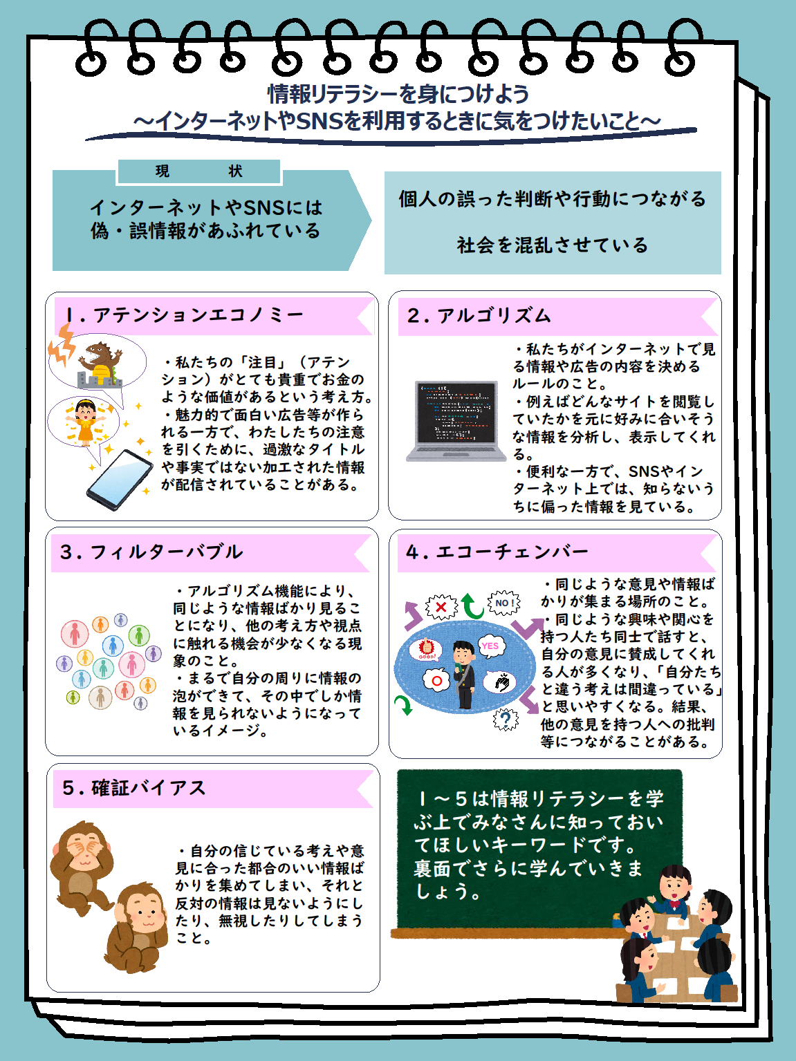 情報リテラシーを身につけ、それら偽・誤情報の氾濫に対応できるようにしましょう。