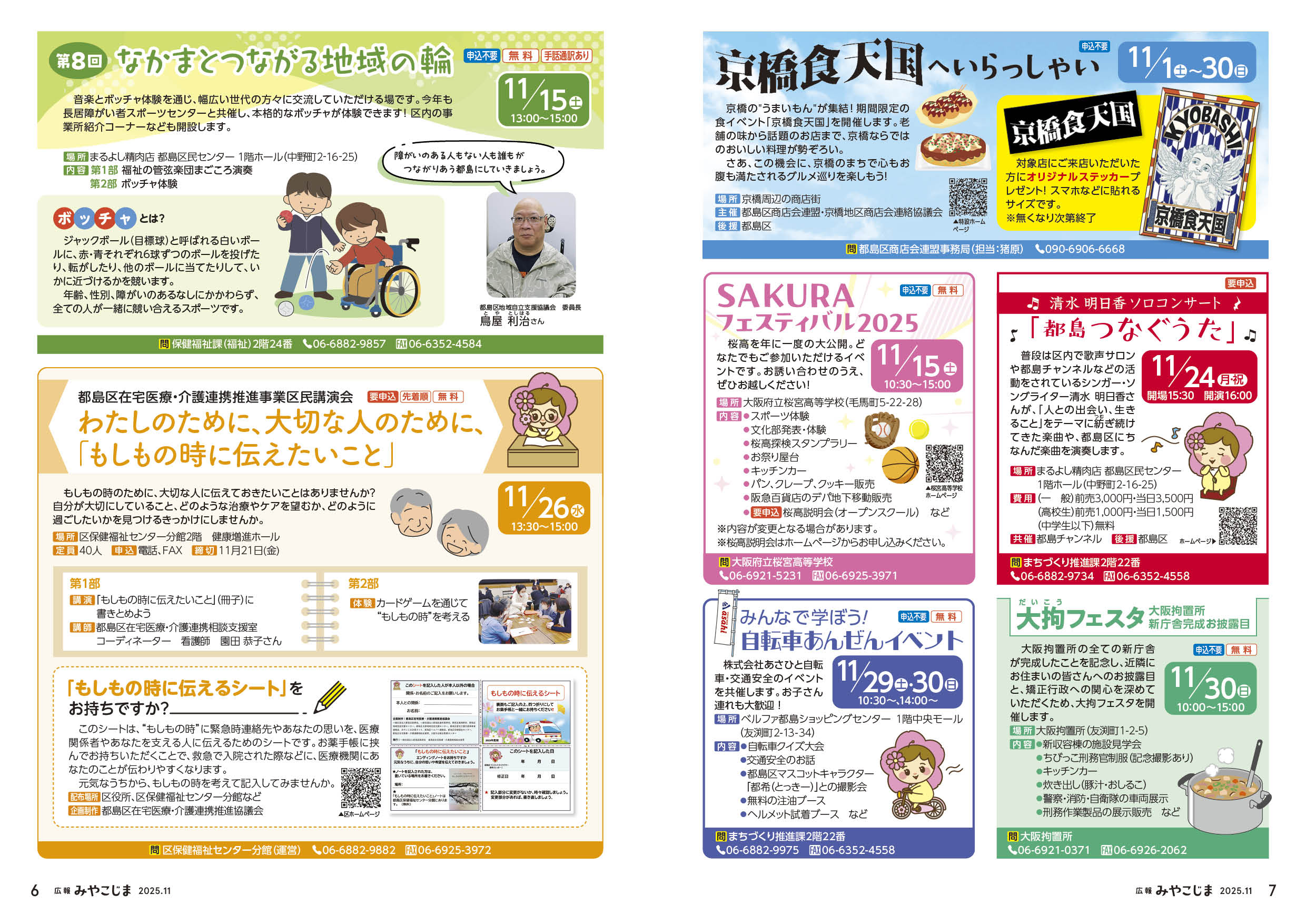 7ページ 京橋食天国へいらっしゃい、SAKURAフェスティバル2025、清水 明日香ソロコンサート「都島つなぐうた」、みんなで学ぼう!自転車あんぜんイベント、大拘フェスタ(MP3形式, 4.76MB)