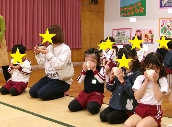 園長:いきいき教室(園内プランターのお花の苗植え)、お茶会、福祉会館訪問などがあります。福祉会館訪問は、1学期ごとに各学年が遊びに行き、年配の方との交流の機会を作っています。お茶会は、お茶の先生に来ていただき、5人ずつ交代で、敷畳に座りお作法を教えていただいています。