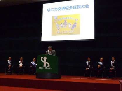 推進本部では交通事故のない社会の実現に向け、平成25年4月5日に開催されました「なにわ交通安全区民大会」におきまして、『浪速区交通安全宣言』を行いました。