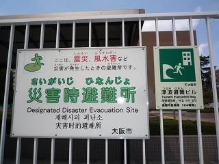 津波(つなみ)が来(き)たときに、逃(に)げれるビル(びる)マンション(まんしょん)学校(がっこう)に津波避難(つなみひなん)シール(しーる)を貼(は)っています。