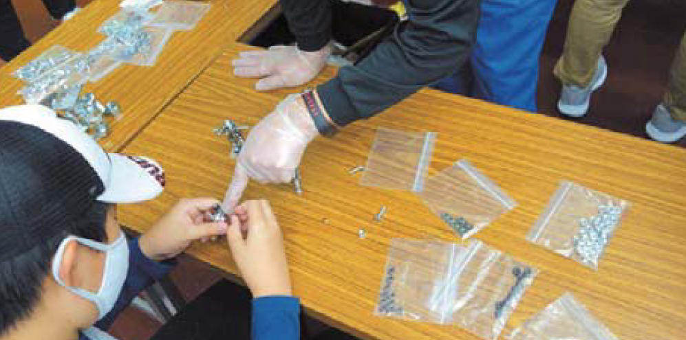 ネジを使ってキーホルダーなどを作る体験をしてもらいました。準備までは大変でしたが最後に小学生が笑顔で楽しかった~と言ってくれて疲れが吹き飛びました。ありがとうございました。(担当者:日生金属商事株式会社 松浦貴嗣)