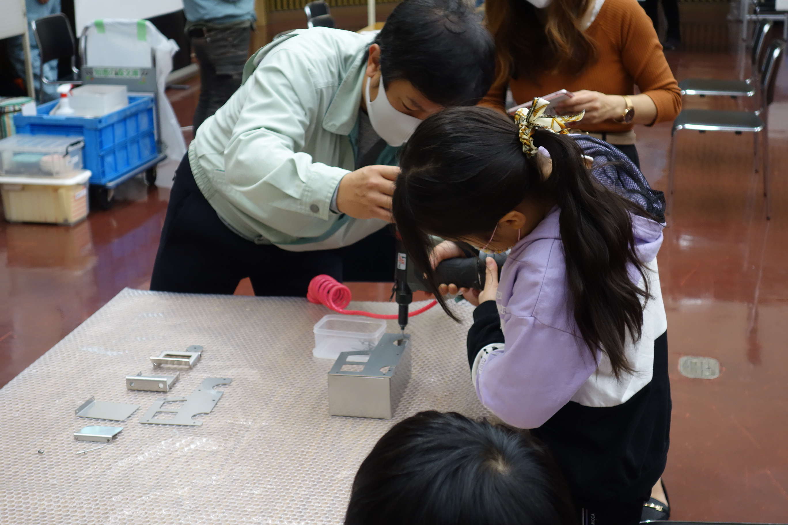 エアーリベッターという工具で、車の形をしたステンレス製の物入れを作る体験をしてもらいました。子どもたちにすごく喜んでもらえたので良かったです。(担当者:株式会社新和製作所 清水修吉)