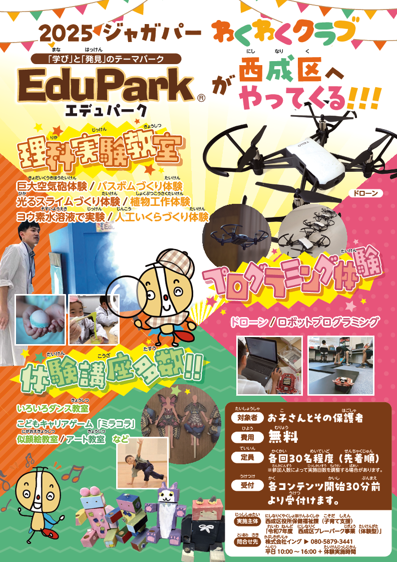 子ども体験活動「ジャガパーわくわくクラブ」では、子どもの好奇心を刺激し物事ヘの興味や関心を広げ、学習意欲を引き出す学び体験型イベントを実施します。