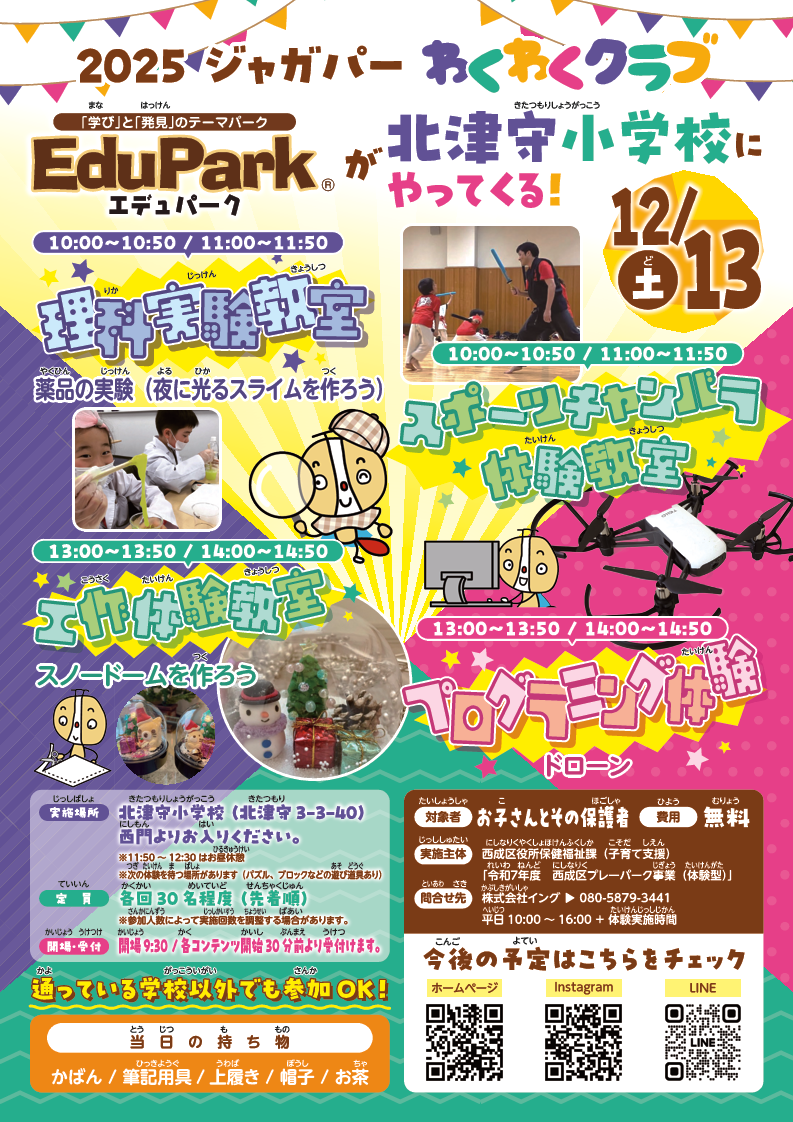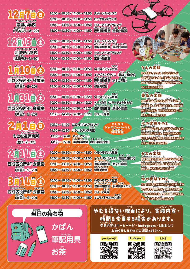 | 12月13日(土曜日) | 北津守小学校 | 薬品の実験 | ドローンプログラミング | 工作教室 | スポーツチャンバラ |