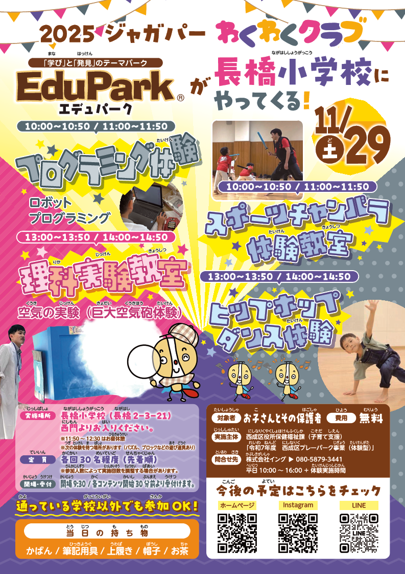 | 11月2日(日曜日) | 千本小学校 | 電気の実験 | ロボットプログラミング | 走り方教室 | ヒップホップダンス |