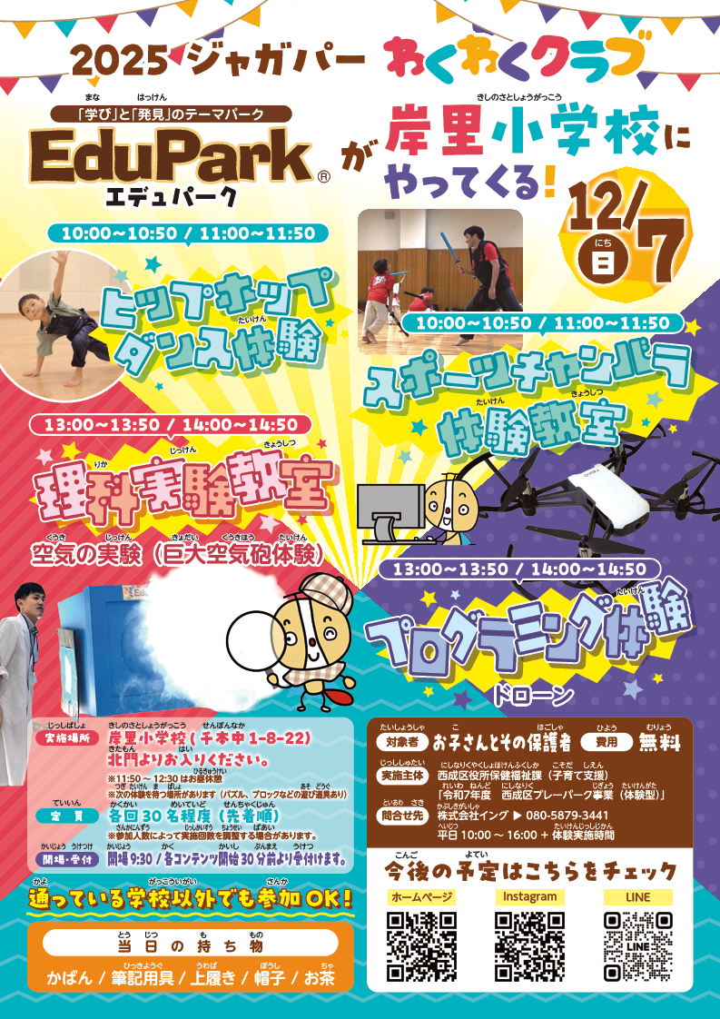 | 12月7日(日曜日) | 岸里小学校 | 空気の実験 | ドローンプログラミング | スポーツチャンバラ | ヒップホップダンス |