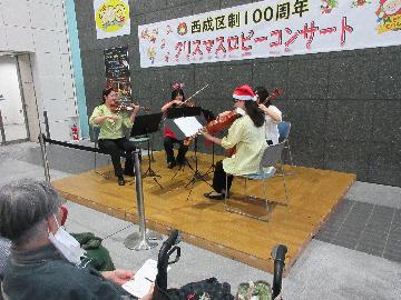 西成区は令和7年4月に区制100周年を迎えました。100周年記念事業テーマの「笑顔うまれるええとこ西成#lol_にしなり:)」にちなんで、みなさまがほっこり笑顔になっていただけるように、大阪フィルハーモニー交響楽団員によるクリスマスソング等の生演奏をお届けしました。2ステージ合わせて、合計364名のたくさんのみなさまにご鑑賞をいただきました。
