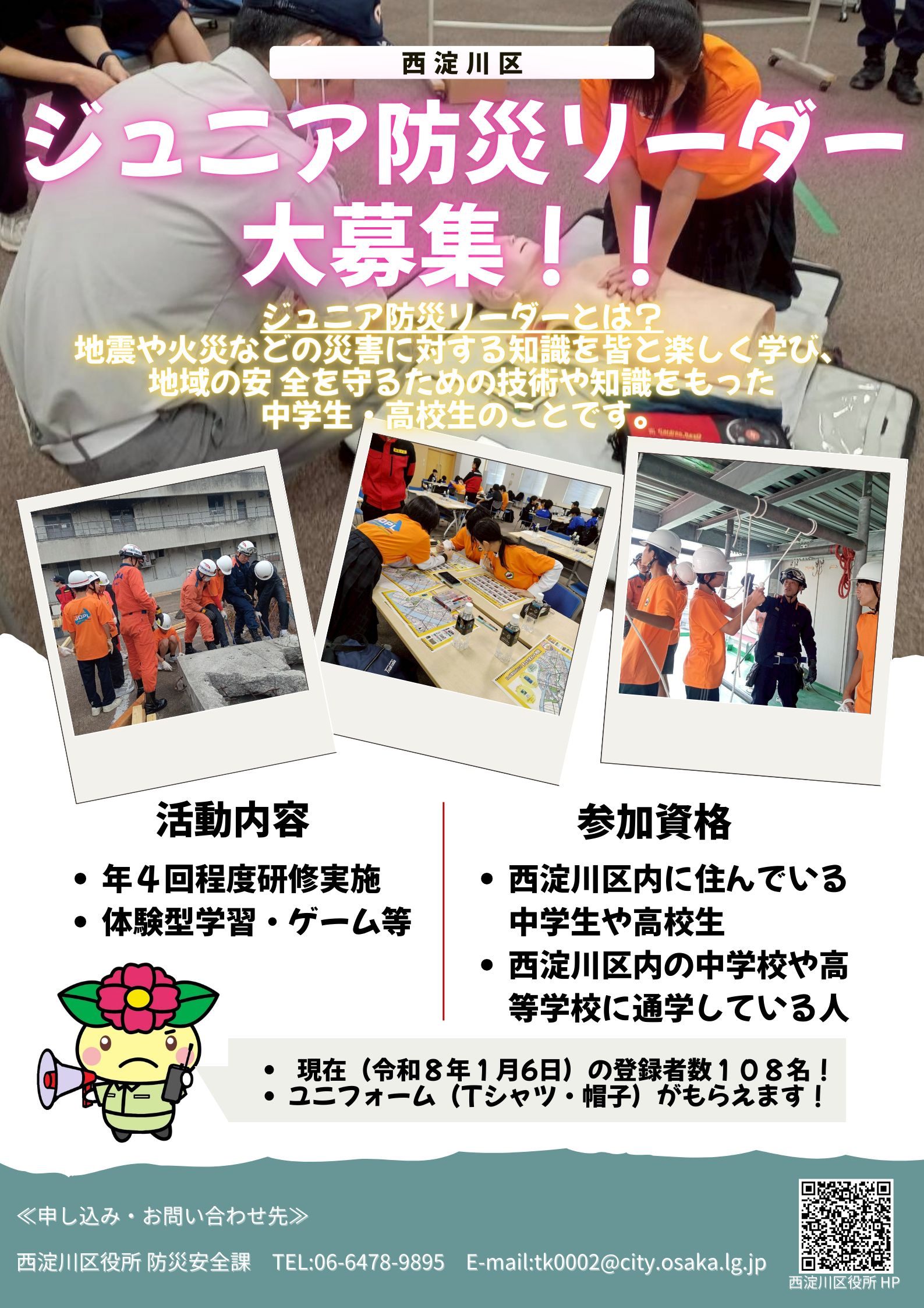 西淀川区では、中学生や高校生などの若い力を地域の防災力向上につなげるため、「西淀川区ジュニア防災リーダークラブ登録制度」を設け、登録者を募集します。