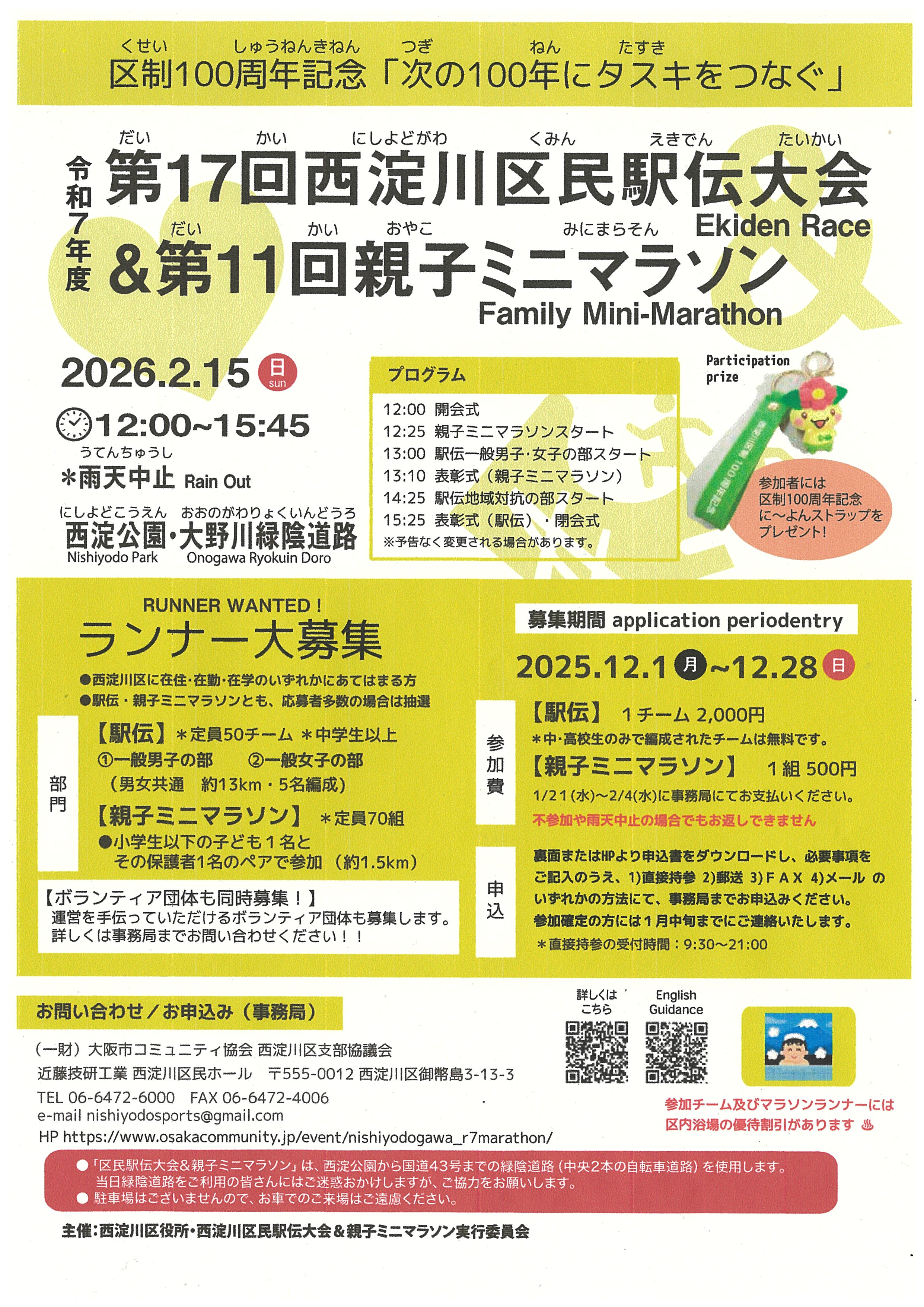 区民駅伝大会&親子ミニマラソン 特設ページ・問合せ(事務局):(一財)大阪市コミュニティ協会西淀川区支部協議会