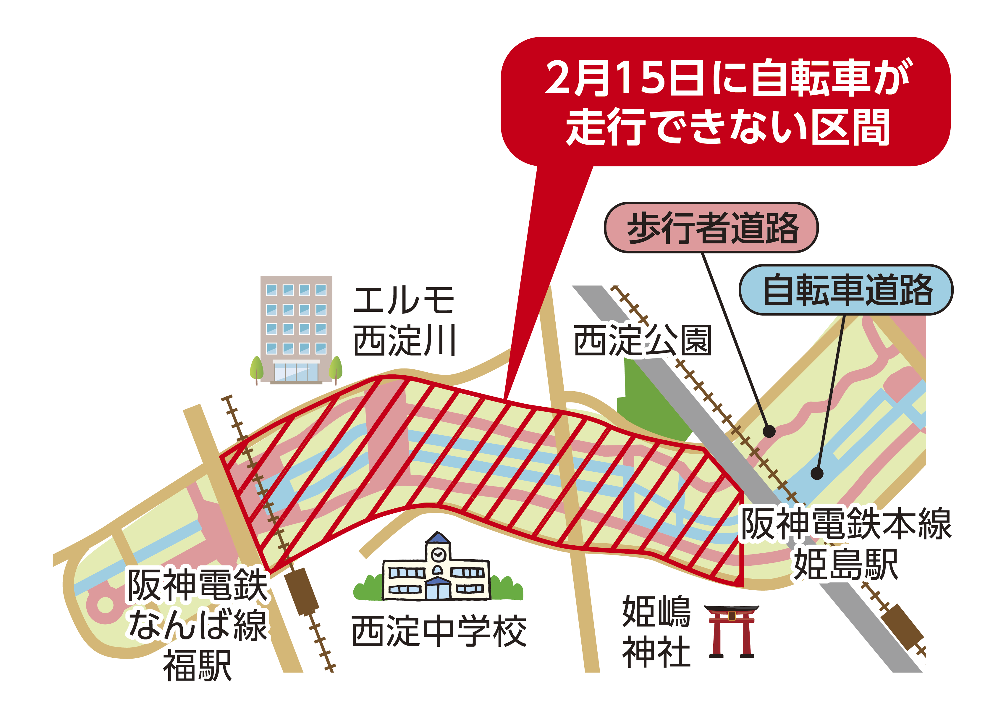 緑陰道路の自転車での走行はご遠慮ください。(西淀公園から国道43号交差地点)