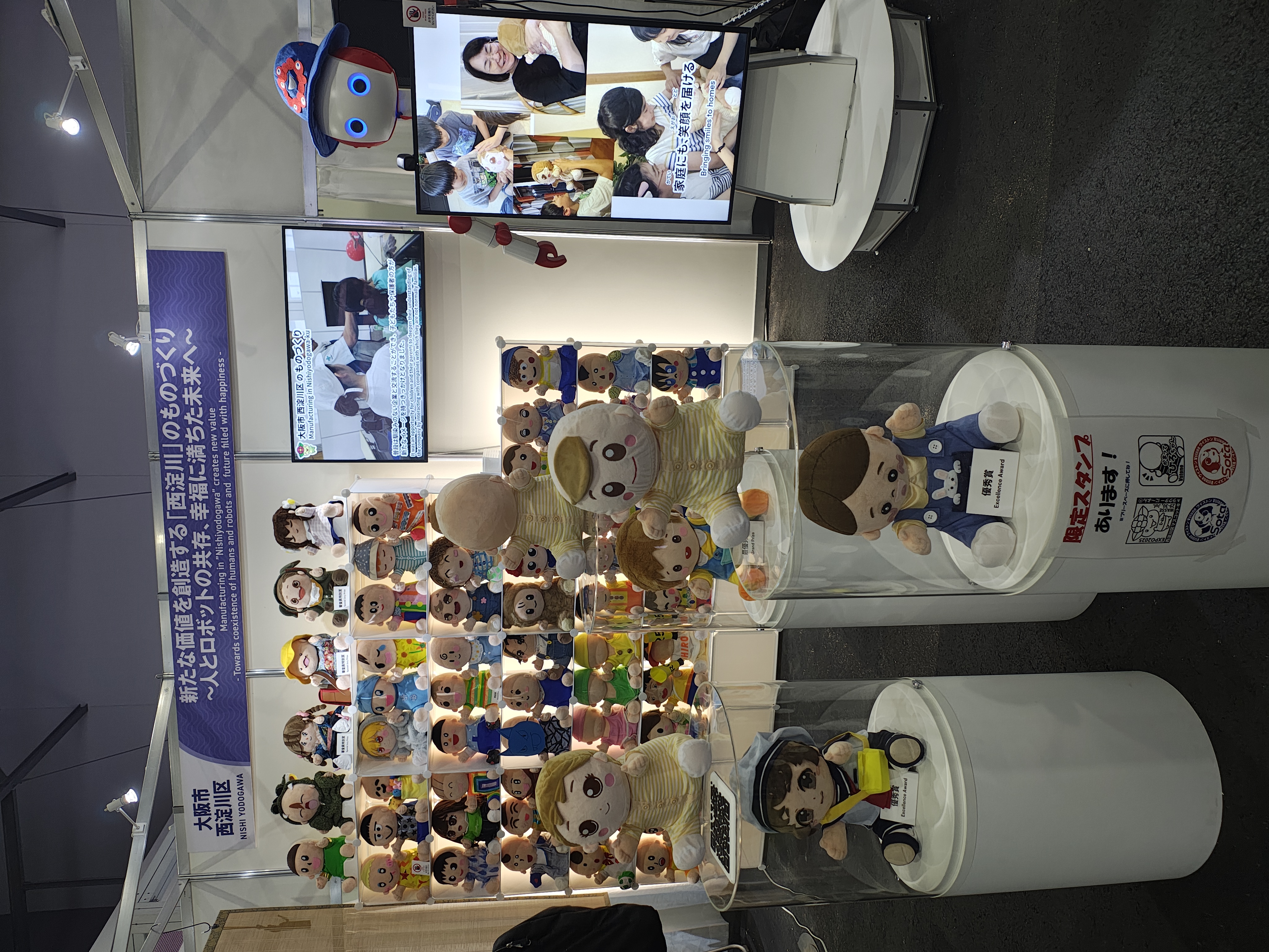 西淀川区の「ものづくり」事業の「西淀川ものづくりまつり」や「オープンファクトリー」の開催の様子を放映することに加え、ヴイストン株式会社が今回の出展に向けて、デザインの応募を行った赤ちゃんロボット『かまって「ひろちゃん」』の展示を行い、来場者の方々に赤ちゃんロボットを体感していただきました。また、ブース内では、スタンプも設置しており、当区のマスコットキャラクターである「に~よん」のスタンプも押すことができました。