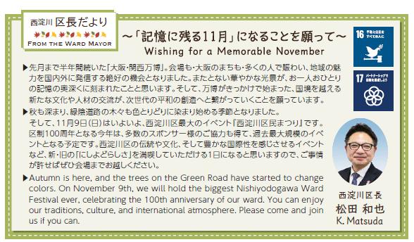 ▶Autumn is here, and the trees on the Green Road have started to change colors. On November 9th, we will hold the biggest Nishiyodogawa Ward Festival ever, celebrating the 100th anniversary of our ward. You can enjoy our traditions, culture, and international atmosphere. Please come and join us if you can.