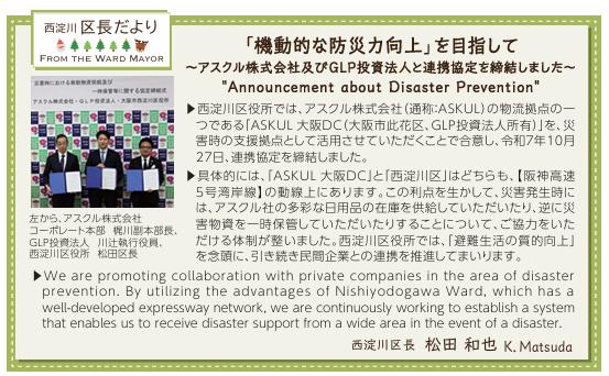 ▶西淀川区役所では、アスクル株式会社(通称:ASKUL)の物流拠点の一つである「ASKUL大阪DC(大阪市此花区、GLP投資法人所有)」を、災害時の支援拠点として活用させていただくことで合意し、令和7年10月27日、連携協定を締結しました。
