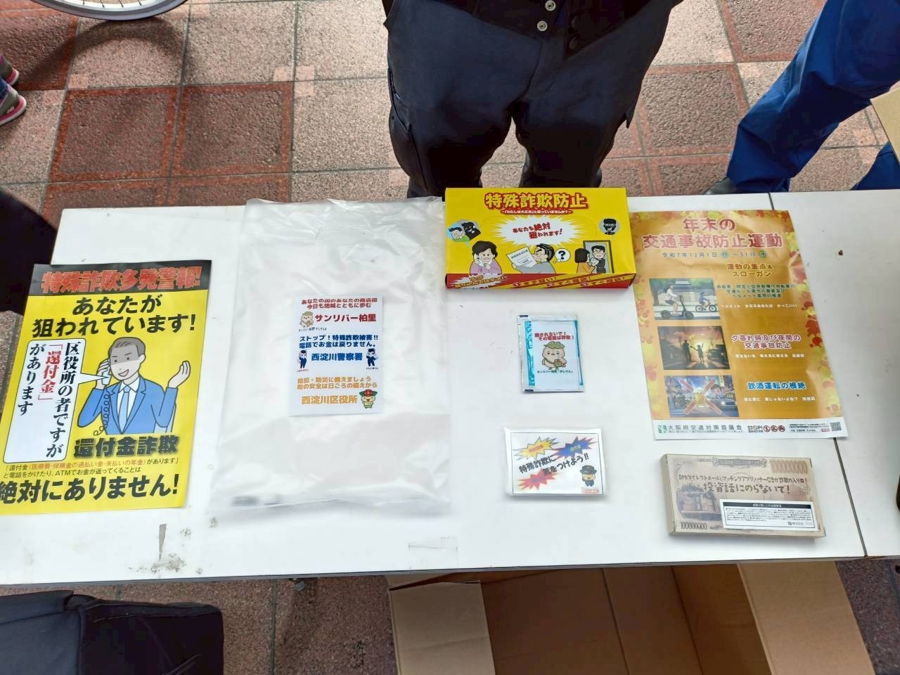 歳末特別警戒中の令和7年12月15日(月曜日)午前11時から、西淀川区柏里地域にあるサンリバー柏里商店街において、特殊詐欺被害防止・年末の交通事故防止キャンペーンを実施しました。