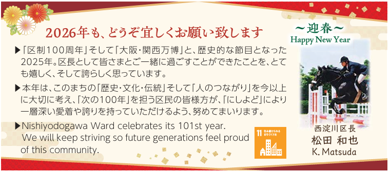 ▶本年は、このまちの「歴史・文化・伝統」そして「人のつながり」を今以上に大切に考え、「次の100年」を担う区民の皆様方が、「にしよど」により一層深い愛着や誇りを持っていただけるよう、努めてまいります。