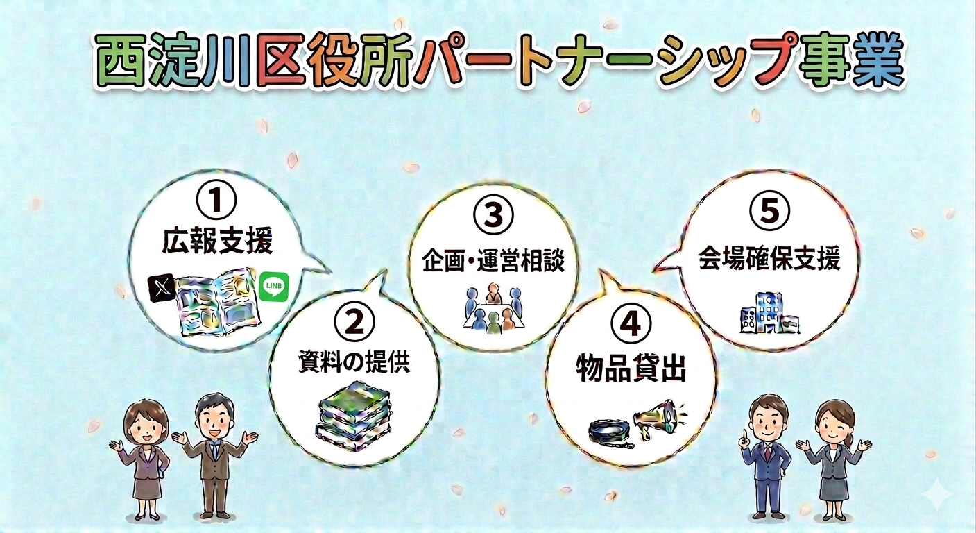 民間企業や地域団体等が実施する事業のうち、西淀川区の施策に合致し、有効性が高いと認められるものについては、区広報紙「きらり☆にしよど」への掲載や名義使用にとどまらず、事業実施の確実性を高めるための取組が求められてきました。