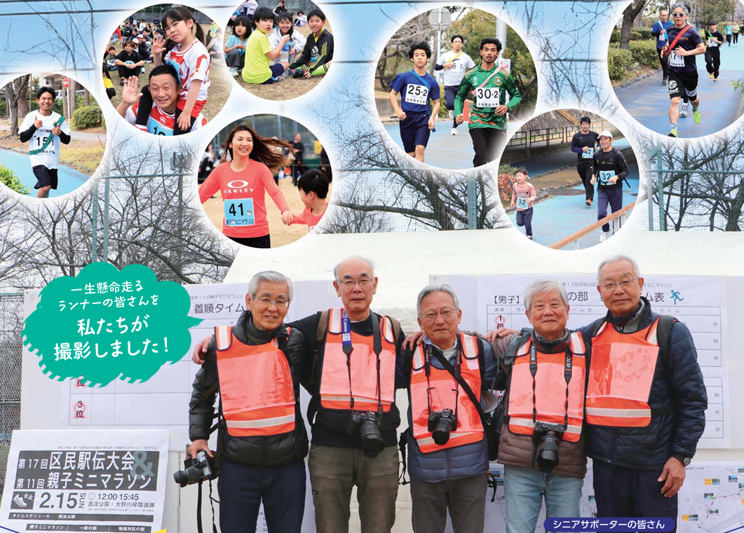 2月に開催された区民駅伝大会&親子ミニマラソンでは、認定NPO法人大阪府高齢者大学校に通われているシニアの皆さんがカメラマンとして運営に参加し、選手の表情やゴールの瞬間を撮影しました。