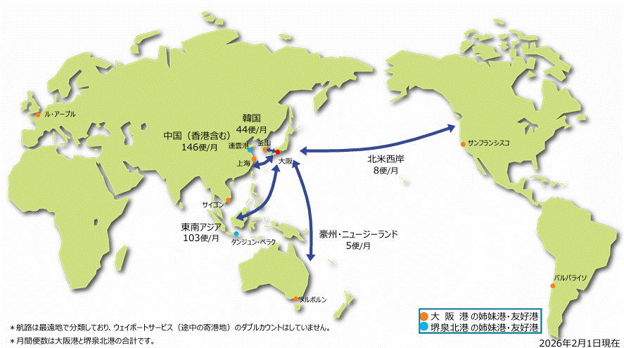 大阪港及び堺泉北港では、両港合わせ1ヶ月あたり306便の外貿定期コンテナ航路が運航されており、北米、豪州、アジアなど世界の主要港と結ばれています。また、夢洲・咲洲及び助松のコンテナ埠頭を合わせ、年間約204万TEU(2024年速報値)の外国貿易によるコンテナ貨物が取り扱われています。