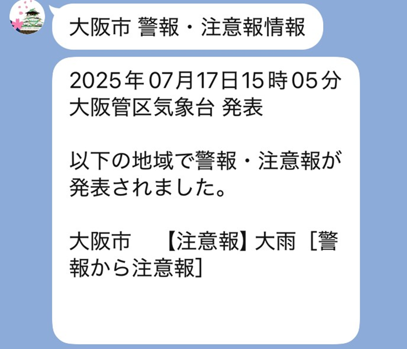 受信設定(基本情報登録)で「防災」を選択していただくと、「おおさか防災ネット」の防災情報メールと連携し、気象情報の警報情報(大雨・洪水・大雪・暴風・暴風雪・波浪・高潮)が届きます。