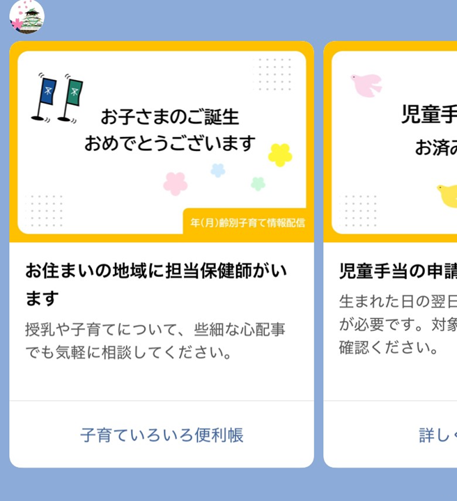 受信設定(基本情報登録)で「子育て情報」の受信を希望するとご回答いただいた方へ、お子さんの年(月)齢等に合わせたお役立ち情報をお届けしています。ぜひご利用ください。