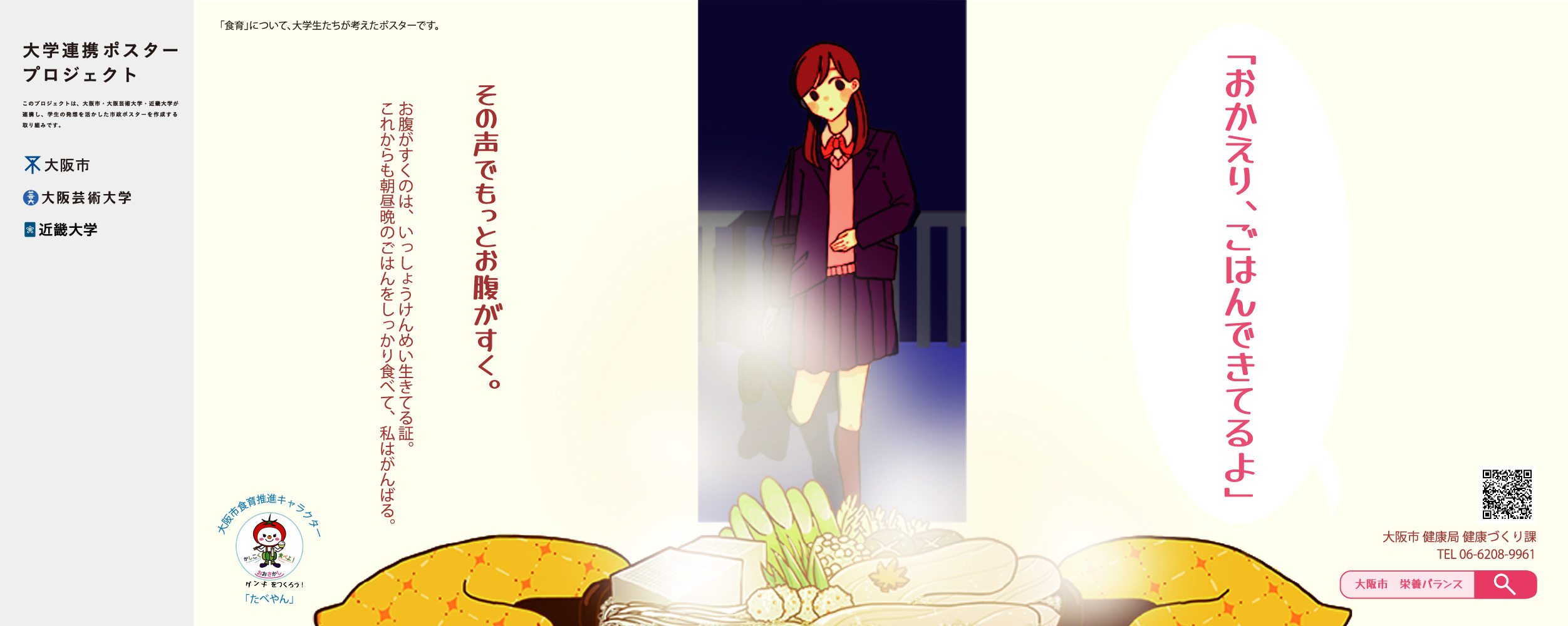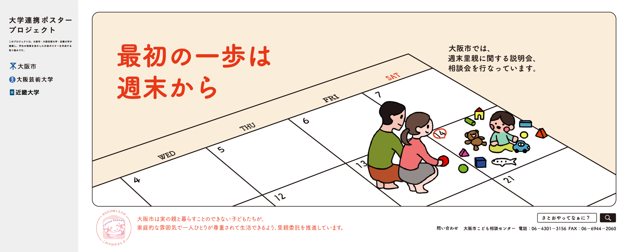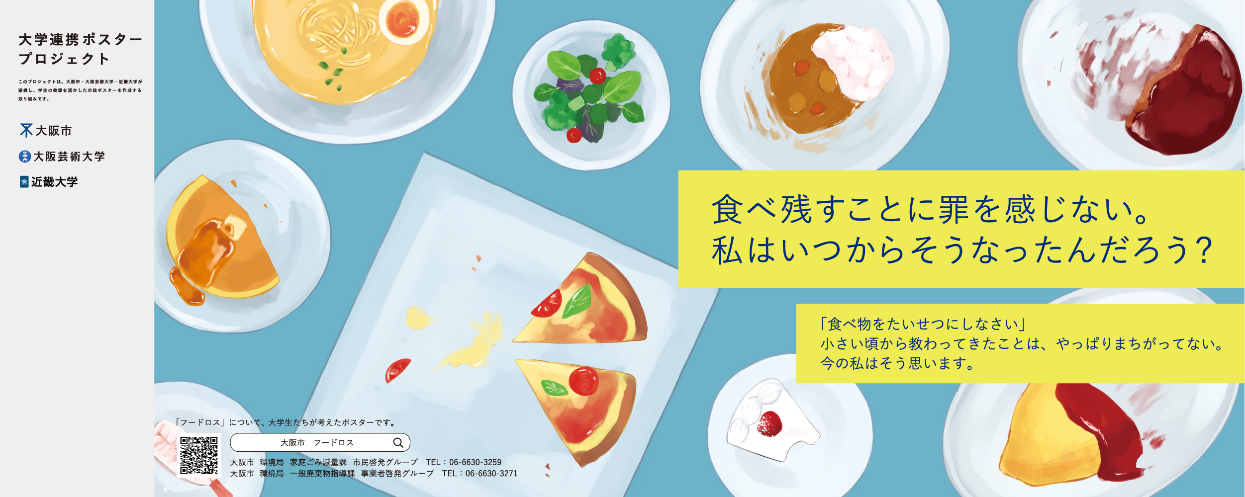 「大学連携ポスタープロジェクト」は、大阪市、大阪芸術大学並びに近畿大学総合社会学部の三者が連携し、学生ならではの発想を活かした市政ポスターを作成する取り組みです。