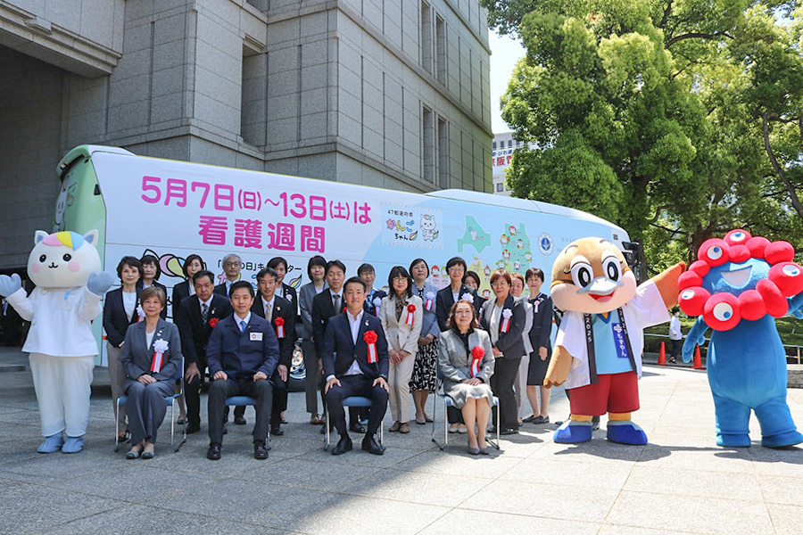 大阪市長は、看護週間期間中である5月9日に市役所玄関前で開催された「看護の日・看護週間事業PRバス出発式」に吉村知事、大阪府訪問看護ステーション協会会長、大阪府看護協会会長らとともに出席しました。
