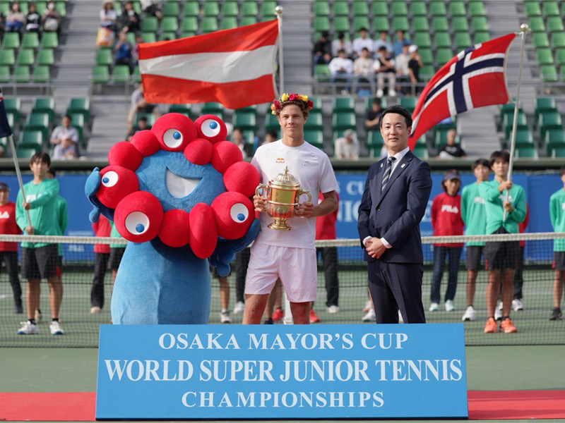 あいさつの中で、各国の代表チームや観戦に来られた方を歓迎し、3日間にわたり熱戦を繰り広げられた選手をはじめ、協賛企業、ボランティアの方々に対する感謝の意を表するとともに、大阪・関西万博の公式キャラクター「ミャクミャク」とともに万博をPRしました。