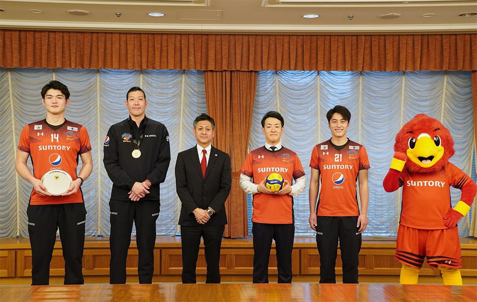 市長は「世界クラブ男子選手権大会で銅メダルを獲得した勢いのまま、是非Vリーグでも優勝していただきたい」と激励し、サントリーサンバーズの山村宏太監督から「銅メダルを獲得したことにより選手にはプレッシャーもかかっているが、優勝に向けて世界3位の名に恥じない戦いをしたい」とのコメントを受けました。