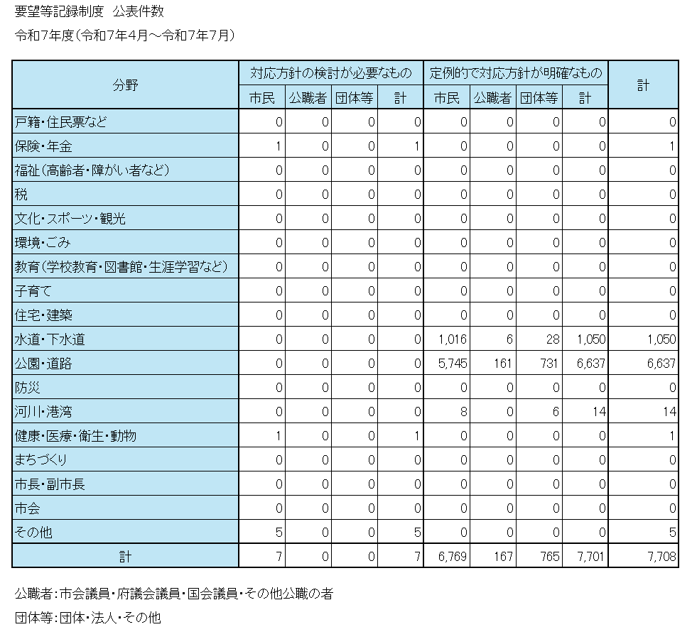 要望等の中でも、本市によく寄せられ、本市の対応方針が明確なものについて、要望等と対応方針の概要毎にその件数を掲載しています。(令和7年4月から令和7年8月)