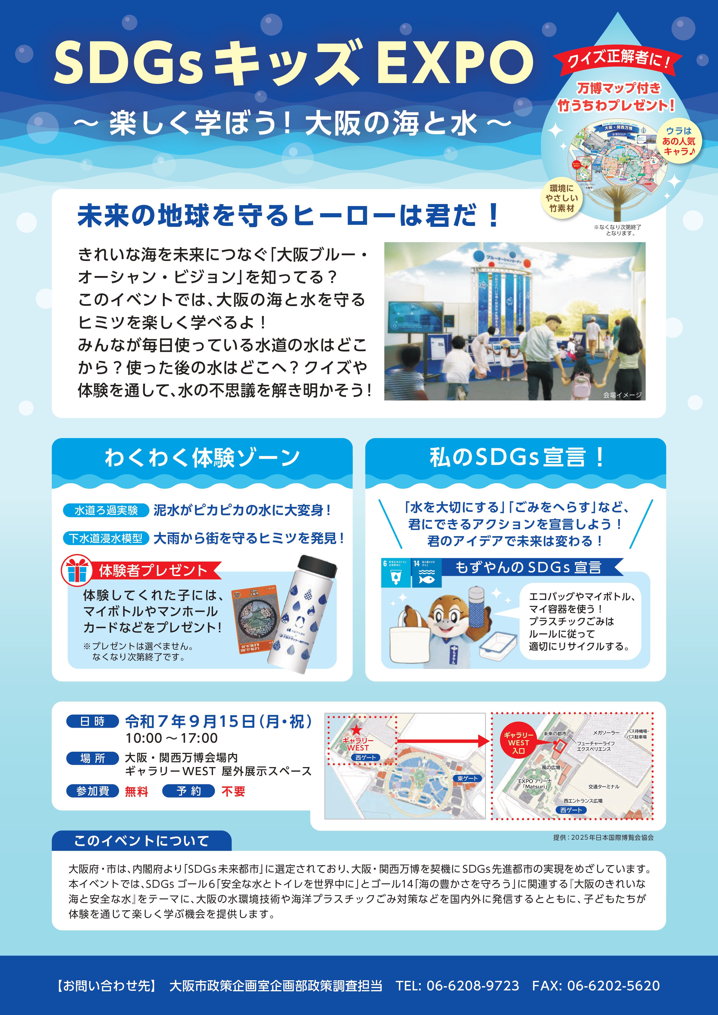 大阪・関西万博では、大阪府・市や府内市町村それぞれが事業主体となり、テーマに応じて連携しながら特色ある催事を展開する「大阪ウィーク」を開催していますが、この度、大阪市は大阪府と共同で、令和7年9月15日(月曜日・祝日)に、万博会場ギャラリーWESTにおいて、「SDGsキッズEXPO~楽しく学ぼう!大阪の海と水~」を開催します。