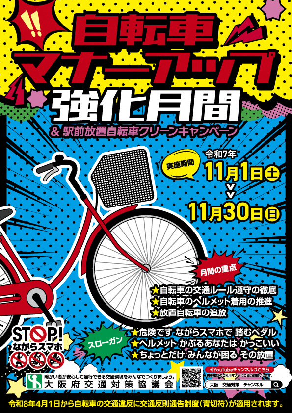 この強化月間は、広く府民に自転車利用に関する交通ルールの遵守と正しい交通マナーの実践を習慣づけることによって、自転車の安全利用を促進し、自転車利用者による交通事故防止の徹底を図ることを目的としています。
