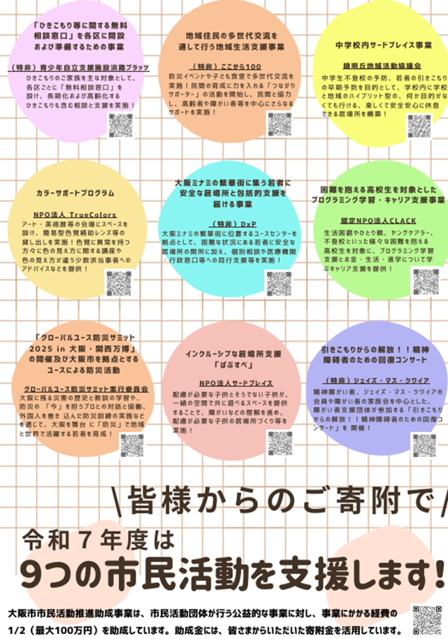 申請期間(令和6年10月21日~令和6年11月20日)において、14件の申請があり、市民活動推進事業運営会議による審査内容を基に、次の9事業を令和7年度市民活動推進助成事業に選定しました。