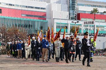 局章旗をはじめに、署旗大隊、指揮者旗大隊、予防大隊、消火大隊、救助大隊、救急大隊、緊急消防援助隊、災害活動支援隊が行進します。