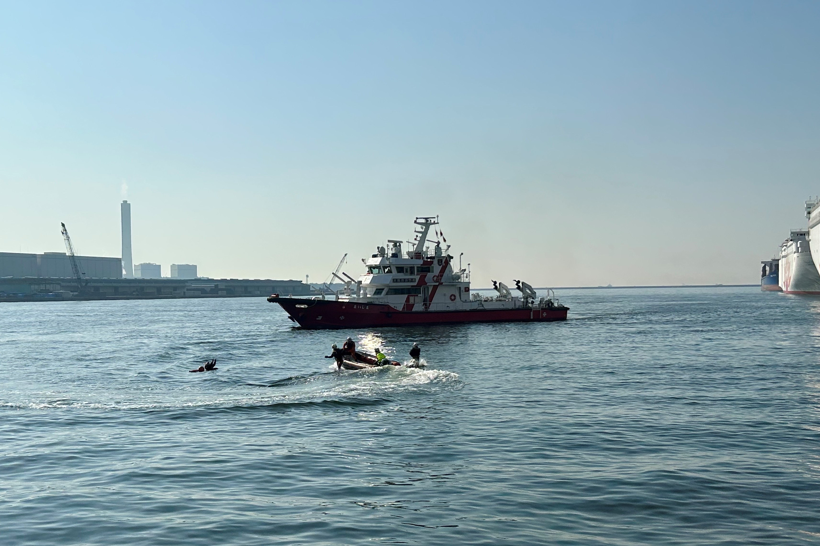 本部特別高度救助隊の操作するドローンにより、海面に漂流している要救助者を発見後、消防救助艇「ゆめしま2号」が救出に向かい、水難救助隊員1名が海面に入水し、船内に一時確保後、消防艇「まいしま」甲板上へ搬送します。