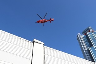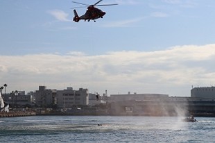 続いて、上空の消防ヘリコプターから航空救助隊員1名がホイスト降下し、要救助者をホイストにより吊り上げて、消防ヘリコプターに救出します。