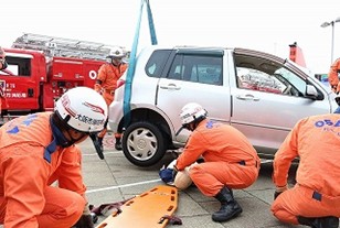 地震により、建物の倒壊や多数の車両事故が発生している状況の中、救助活動を実施します。