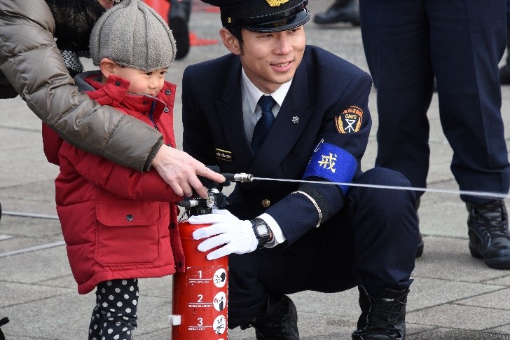 ピロティ広場(屋外)では、消防車両等の展示、子ども用防火衣を着用しミニ消防車との記念撮影、起震車による地震体験、水消火器による放水体験を実施します。