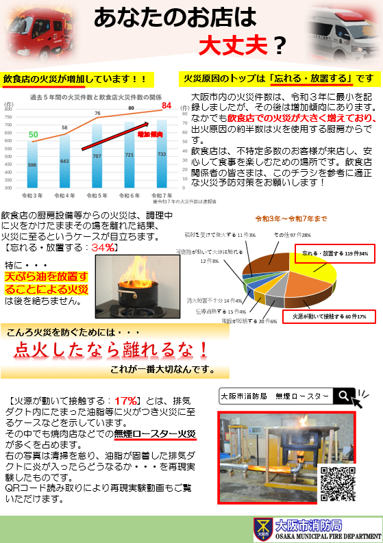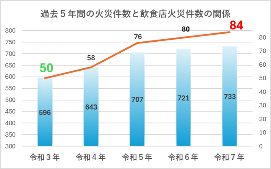 大阪市内の火災件数は令和3年以降増加傾向で、令和7年の火災件数は昨年と比べて12件(令和7年の火災件数は速報値)の増加となっています。令和7年は733件の火災が発生しましたが、その内飲食店における火災が84件と過去5年で最も件数が多くなっています(グラフ1参照)。