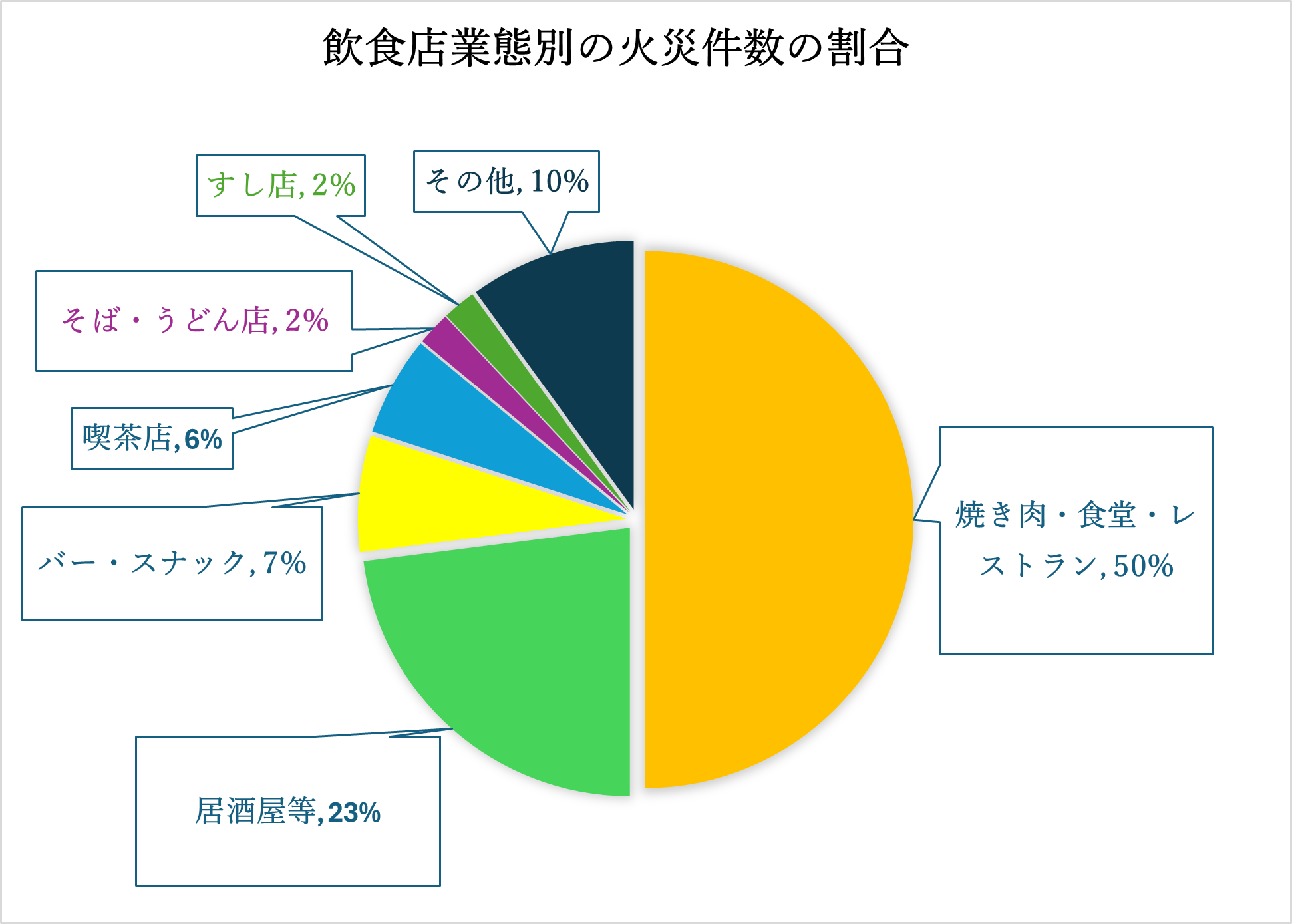 飲食店での火災の内訳として、「焼肉・食堂・レストラン」が50% (174件)、「居酒屋等」が23%(79件)となっており、これら2つの業態で全体の7割近くを占めています。