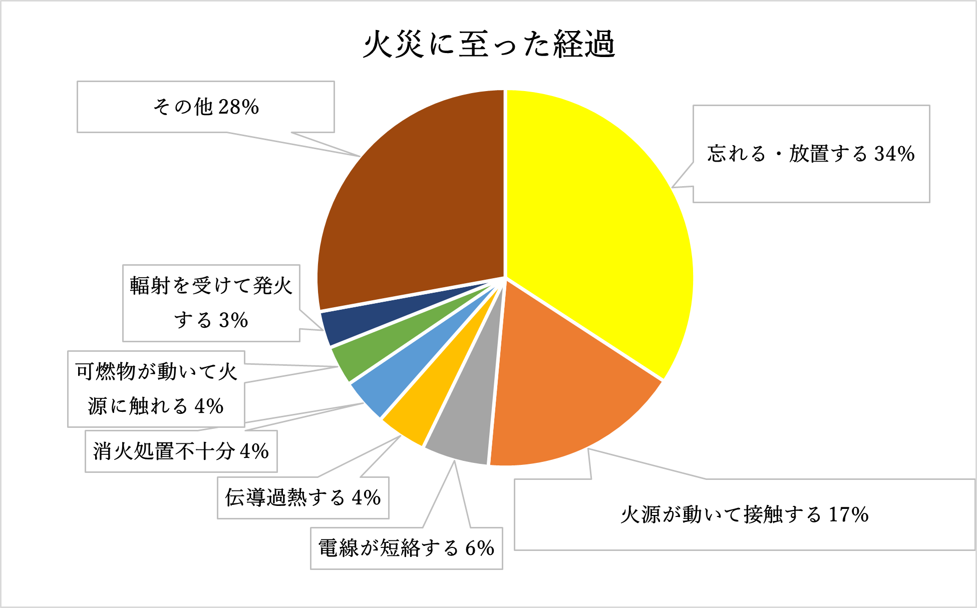 火災に至った主な経緯で最も多かったのが「忘れる・放置する」の34%(119件)で、天ぷら油の過熱やこんろ周りに置かれた物品からの出火となっています。次いで、「火源が動いて接触する」は17%(60件)となっており、排気ダクト内にたまった油脂等に着火し火災に至るケースが多く、焼き肉店の無煙ロースター等での事例が多く発生しています。