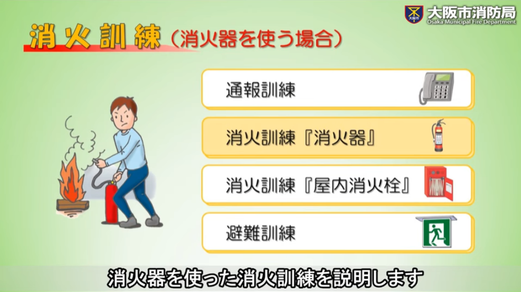 - 消火器の位置を確認し、定期的な点検や必要に応じて交換し、万一に備えて使用方法を覚えておくこと
